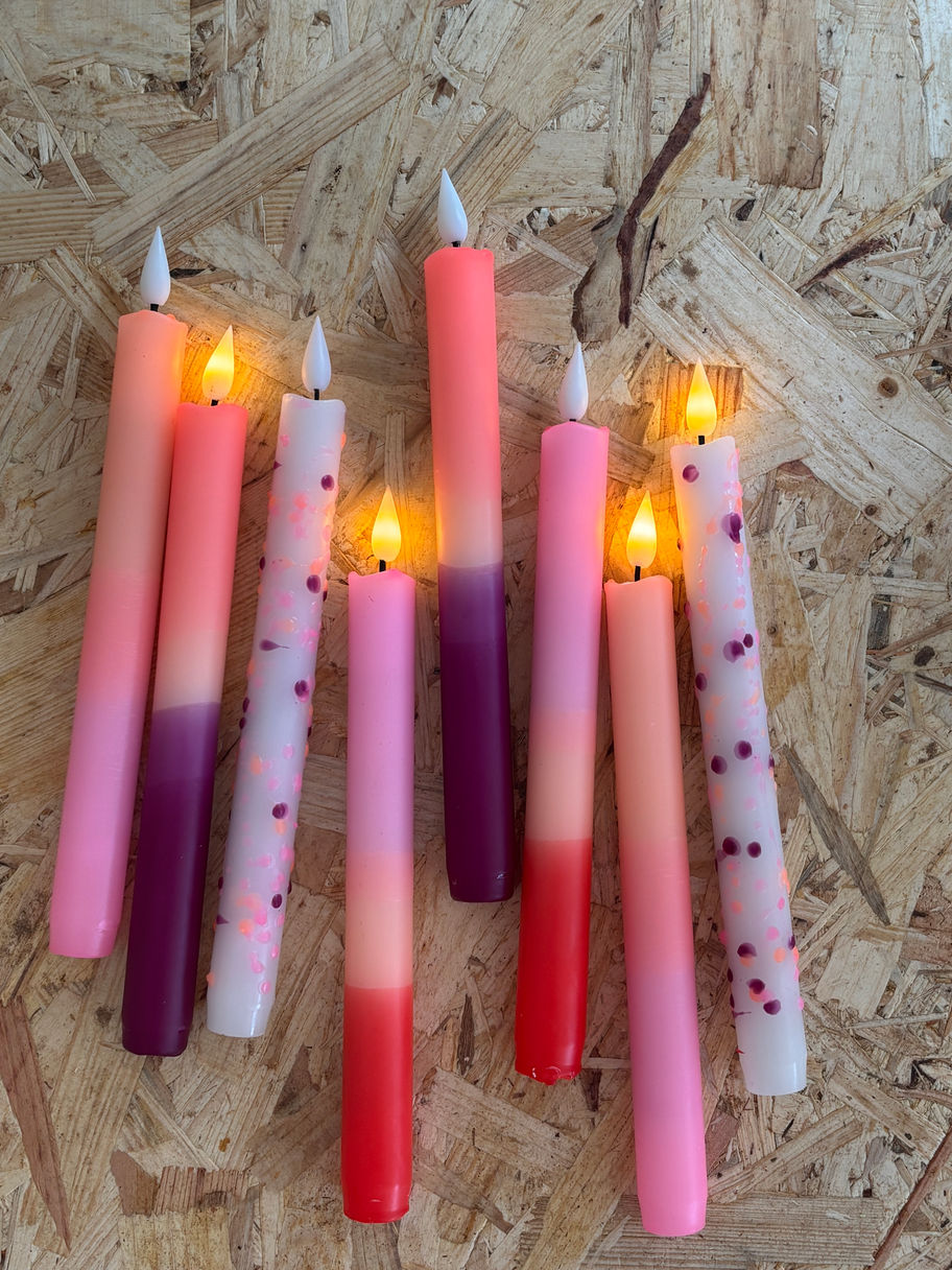 Sfeermakers gezocht? Onze LED dip dye kaarsen zijn een must-have voor elke winkel, salon, bloemist of hotel! Ze zien eruit als echte kaarsen, maar zonder roet of vlam - veilig, stijlvol en super handig. Perfect voor etalages, styling hoeken of tafeldecoratie. Combineer ze met onze handgemaakte houders of mix ze met echte kaarsen voor een speels effect. Eén ding is zeker: jouw klanten willen ze ook!